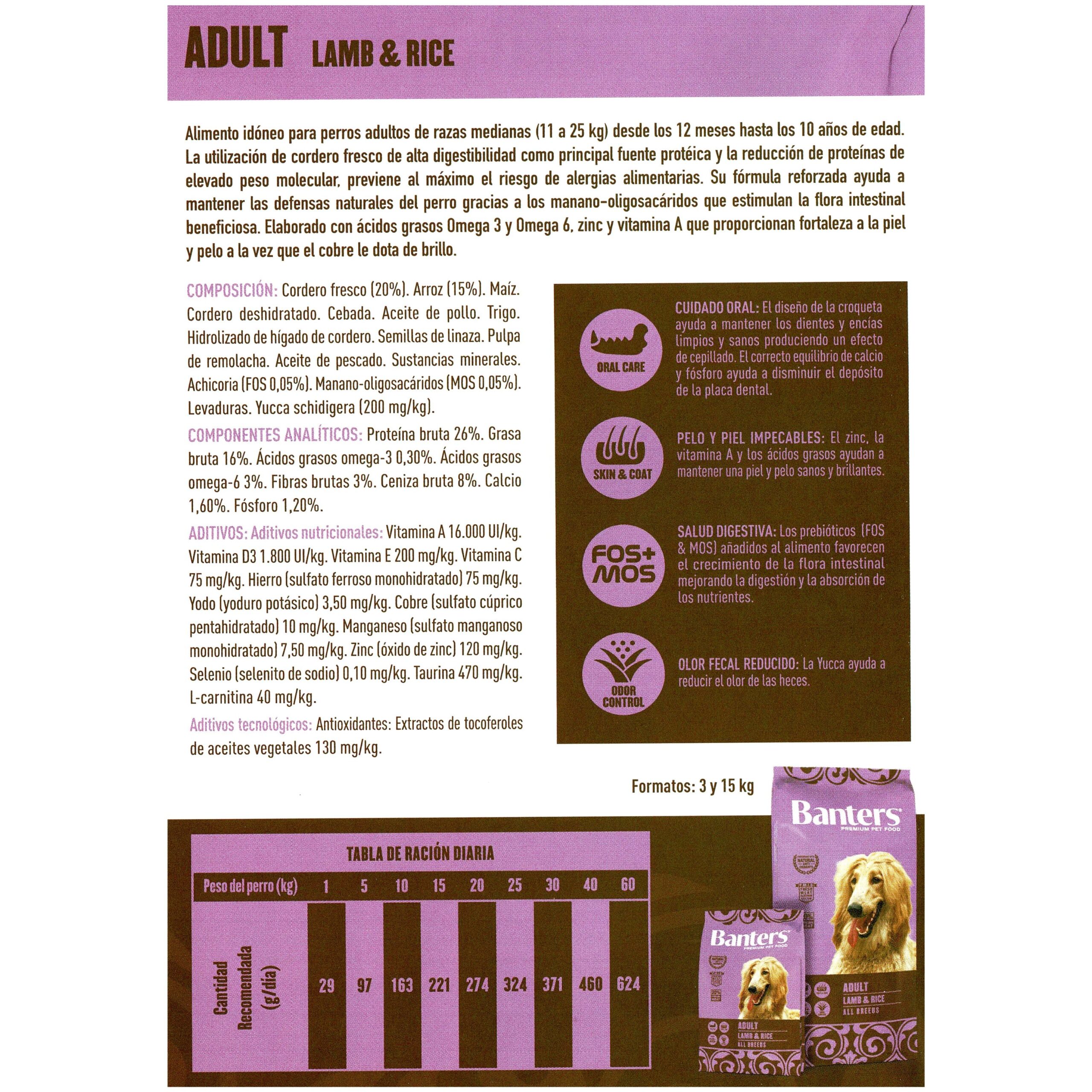 Banters Adult Lamb & Rice ALIMENTO COMPLETO para PERROS ADULTOS Alimento idóneo para perros adultos de razas medianas (11 a 25 kg) desde los 12 meses hasta los 10 años de edad. La utilización de carne de cordero fresca de alta digestibilidad como principal fuente protéica y la reducción de proteínas de elevado peso molecular, previene al máximo el riesgo de alergias alimentarias. Su fórmula reforzada ayuda a mantener las defensas naturales del perro gracias a los mananooligosacáridos que estimulan la flora intestinal beneficiosa. Elaborado con ácidos grasos Omega 3 y Omega 6, zinc y vitamina A que proporcionan fortaleza a la piel y pelo a la vez que el cobre la dota de brillo.INGREDIENTES: Cordero freso (20%), Arroz (15%), Maiz, Cordero deshudratado, Cebada, Aceite de pollo, Trigo, Hidrolizado de higado de cordero, Semillas de Linaza, Pulpa de Remolacha, Aceite de pescado, Sustancias minerales, Achicoria (FOS 0.05%), Manano-oligosacaridos (MOS 0.05%), Levaduras, Yucca schidigera (200mg/kg)CONSTITUYENTES ANALITICOS: Proteína bruta 26,00 %, grasas brutos 16,00 %, acidos grasos Omega-3 0.30%, Acido grasos Omega-6 3%, Fibras brura 3%, Ceniza bruta 8%, Calcio 1.6%, Fosforo 1.20%ADITIVOS NUTRICIONALES:Vitamina A 16.000 UI/Kg. Vitamina D3 1.800 UI/Kg. Vitamina E 200 mg/Kg. Hierro (sulfato monohidratado) 75 mg/Kg. Yodo (Yoduro pota´sico) 3,5 mg/Kg. Cobre (Sulfato pentahidratado) 10 mg/Kg. Manganeso (sulfato monohidratado) 7,5 mg/Kg. Zinc (oxido) 150 mg/Kg. Selenio 0,2 mg/Kg. Taurina 470 mg/Kg. L- carnitina 40 mg/Kg.TECNOLOGICOS:Antioxidantes naturales (tocoferoles).Instrucciones de AlimentaciónAl realizar un cambio en la alimentación, se recomienda introducir gradualmente el nuevo alimento durante los 3 primeros días. Alimentar a la mascota con dos tomas diarias, según recomendación orientativa de la Tabla de Ración diaria. Su mascota puede comer más o menos dependiendo de su edad, temperamento y nivel de actividad. Disponer de agua fresca a libre disposición de la mascota. Conservar el producto en lugar fresco y seco.Tabla de Ración DiariaPesoGramosHasta 5 kg.49 – 97 g/día5 – 10 kg.97 – 163 g/día10 – 20 kg.163 – 274 g/día20 – 30 kg.274 – 371 g/día30 – 40 Kg. 371 – 460 g/día 40 – 50 Kg. 460 – 544 g/día 50 – 60 Kg. 544 – 624 g/día Beneficios- Mejora el sistema inmunitario gracias a los ácidos grasos esenciales Omega 3 y Omega 6- Favorece el tracto digestivo tras la combinación de los prebióticos: FOS y MOS- Protectores de piel y pelo gracias a la relación óptima Zinc, Cobre, Vitamina A y tocoferoles- Control del cuidado dental, Óptima relación calcio / fósforo en combinación con la fibra dietética- Carne fresca como la mejor fuente protéica que genera mayor digestibilidad y calidad del producto