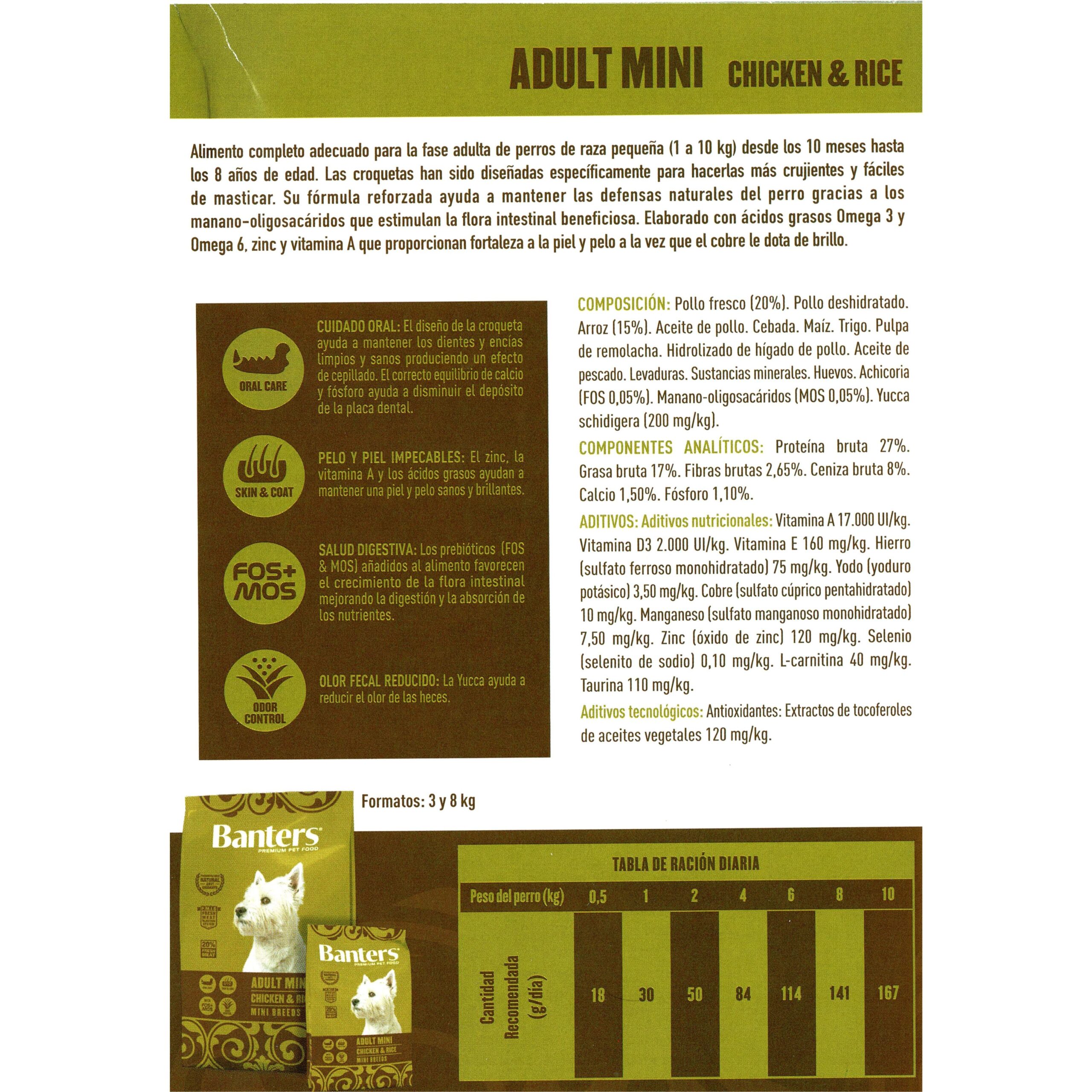 Banters Adult Mini Chicken & RiceAlimento completo adecuado para la fase adulta de perros de raza pequeña (1 a 10 kg) desde los 10 meses hasta los 8 años de edad. Las croquetas han sido diseñadas específicamente para hacerlas más crujientes y fáciles de masticar. Su fórmula reforzada ayuda a mantener las defensas naturales del perro gracias a los manano-oligosacáridos que estimulan la flora intestinal beneficiosa. Elaborado con ácidos grasos Omega 3 y Omega 6, zinc y vitamina A que proporcionan fortaleza a la piel y pelo a la vez que el cobre le dota de brillo.COMPOSICIÓN:Pollo Fresco (20%), Pollo deshidratado, Arroz (15%), Aceite de pollo, Cebada, Maiz, Trigo, Pulpa de Remolacha, Hidrolizado de higado de Pollo, Aceite de pescado, Levaduras, Sustancias minerales, Huevos, Achicoria (FOS 0.05%), Manano-oligosacaridos (0.05%), Yucca schidigera (200 mg/kg)CONSTITUYENTES ANALÍTICOS:Proteina bruta 27%, Grasa bruta 17%, Fibras bruta 2.65%, Ceniza bruta 8%, Calcio 1.50%, Fosforo 1.10%ADITIVOS NUTRICIONALES:Vitamina A 17.000 UI/Kg. Vitamina D3 2.000 UI/Kg. Vitamina E 160 mg/Kg. Hierro (sulfato monohidratado) 75 mg/Kg. Yodo (Yoduro pota´sico) 3,5 mg/Kg. Cobre (Sulfato pentahidratado) 10 mg/Kg. Manganeso (sulfato monohidratado) 7,5 mg/Kg. Zinc (oxido) 150 mg/Kg. Selenio 0,2 mg/Kg. L-carnitina 40 mg/Kg. Taurina 110 mg/KgTECNOLOGICOS:Antioxidantes naturales (tocoferoles).Instrucciones de AlimentaciónAl realizar un cambio en la alimentación, se recomienda introducir gradualmente el nuevo alimento durante los 3 primeros días. Alimentar a la mascota con dos tomas diarias, según recomendación orientativa de la Tabla de Ración diaria. Su mascota puede comer más o menos dependiendo de su edad, temperamento y nivel de actividad.Disponer de agua fresca a libre disposición de la mascota. Conservar el producto en lugar fresco y seco.Tabla de Ración DiariaPesoGramos2 – 3 kg.47 – 63 g/día3 – 4 kg.63 – 79 g/día4 – 6 kg.79 – 107 g/día6 – 8 kg.107 – 132 g/día8 – 10 kg.132 – 157 g/díaBeneficiosVisan Befeficios optima adult mini chicken and rice- Mejora el sistema inmunitario gracias a los ácidos grasos esenciales Omega 3 y Omega 6- Favorece el tracto digestivo tras la combinación de los prebióticos: FOS y MOS- Protectores de piel y pelo gracias a la relación óptima Zinc, Cobre, Vitamina A y tocoferoles- Control del cuidado dental, Óptima relación calcio / fósforo en combinación con la fibra dietética- Carne fresca como la mejor fuente protéica que genera mayor digestibilidad y calidad del producto