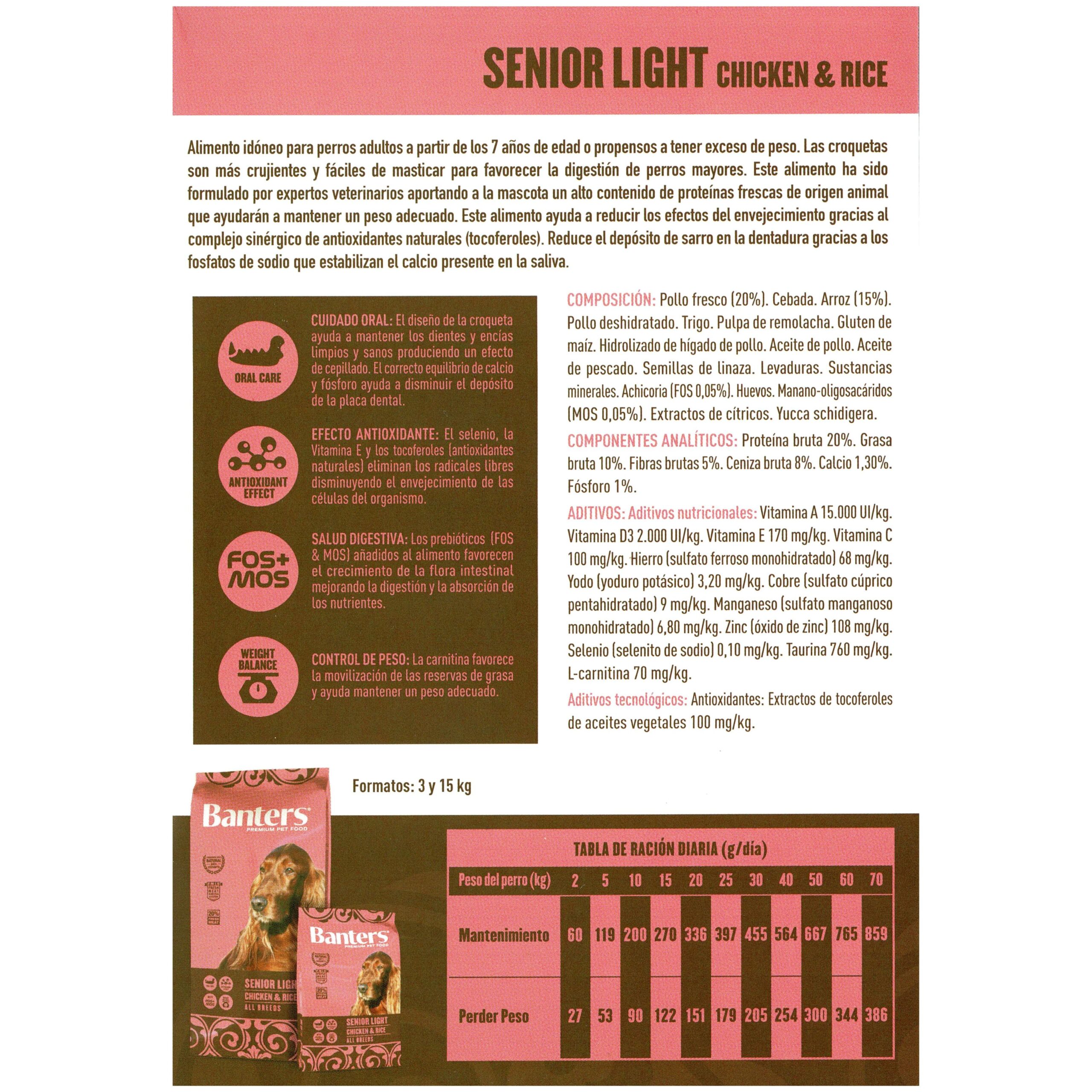 Banters Senior & LightBanters Adult Senior/Light es el alimento idóneo para perros adultos a partir de los 7 años de edad o propensos a tener exceso de peso. Las croquetas son más crujientes y fáciles de masticar para favorecer la digestión de perros mayores. Este alimento ha sido formulado por expertos veterinarios aportando a la mascota un alto contenido de proteínas frescas de origen animal que ayudarán a mantener un peso adecuado. Este alimento ayuda a reducir los efectos del envejecimiento gracias al complejo sinérgico de antioxidantes naturales (tocoferoles). Reduce el depósito de sarro en la dentadura gracias a los fosfatos de sodio que estabilizan el calcio presente en la saliva.Ingredientes: Pollo Fresco (205), Cebada, Arroz (15%), Pollo deshidratado, Trigo, Pulpa de Remolacha, Gluten de maiz, Hidrolizado de higado de Pollo, Aceite de pollo, Aceite de pescado, Semillas de Linaza, Levaduras, Sustancias minerales, Achicoria (FOS 0.05%), Huevos, Manano-oligosacaridos (MOS 0.05%), Extractos citricos, Yucca schidigeraConstituyentes analíticos: Proteina bruta 20%, Grasa bruta 10%, Fibras bruta 5%, ceniza burta 8%, Calcio 1.30%, Fosforo 1%Aditivos: NUTRICIONALES:Vitamina A 15.000 UI/Kg. Vitamina D3 2.000 UI/Kg. Vitamina E 170 mg/Kg. Hierro (sulfato monohidratado) 75 mg/Kg. Yodo (Yoduro pota´sico) 3,5 mg/Kg. Cobre (Sulfato pentahidratado) 10 mg/Kg. Manganeso (sulfato monohidratado) 7,5 mg/Kg. Zinc (oxido) 150 mg/Kg. Selenio 0,2 mg/Kg. Taurina 760 mg/Kg. L- carnitina 40 mg/Kg.TECNOLO´GICOS:Antioxidantes naturales (tocoferoles).Instrucciones de AlimentaciónAl realizar un cambio en la alimentación, se recomienda introducir gradualmente el nuevo alimento durante los 3 primeros días. Alimentar a la mascota con dos tomas diarias, según recomendación orientativa de la Tabla de Ración diaria. Su mascota puede comer más o menos dependiendo de su edad, temperamento y nivel de actividad. Disponer de agua fresca a libre disposición de la mascota. Conservar el producto en lugar fresco y seco.Tabla de Ración DiariaPesoMantenimiento del pesoPerder peso2 – 5 kg.50 – 119 g/día27 – 53 g/día5 – 10 kg.119 – 200 g/día53 – 90 g/día10 – 15 kg.200 – 270 g/día90 – 122 g/día15 – 20 kg.270 – 336 g/día122 – 151 g/día20 – 30 kg. 336 – 455 g/día151 – 205 g/día30 – 40 kg. 455- 564 g/día205 – 254 g/día40 – 50 kg.564 – 667 g/día254 – 300 g/día50 – 60 kg. 667 – 765 g/día300 – 344 g/diaBeneficios- Mejora el sistema inmunitario gracias a los ácidos grasos esenciales Omega 3 y Omega 6- Favorece el tracto digestivo tras la combinación de los prebióticos: FOS y MOS- Protectores de piel y pelo gracias a la relación óptima Zinc, Cobre, Vitamina A y tocoferoles- Control del cuidado dental, Óptima relación calcio / fósforo en combinación con la fibra dietética- Carne fresca como la mejor fuente protéica que genera mayor digestibilidad y calidad del product