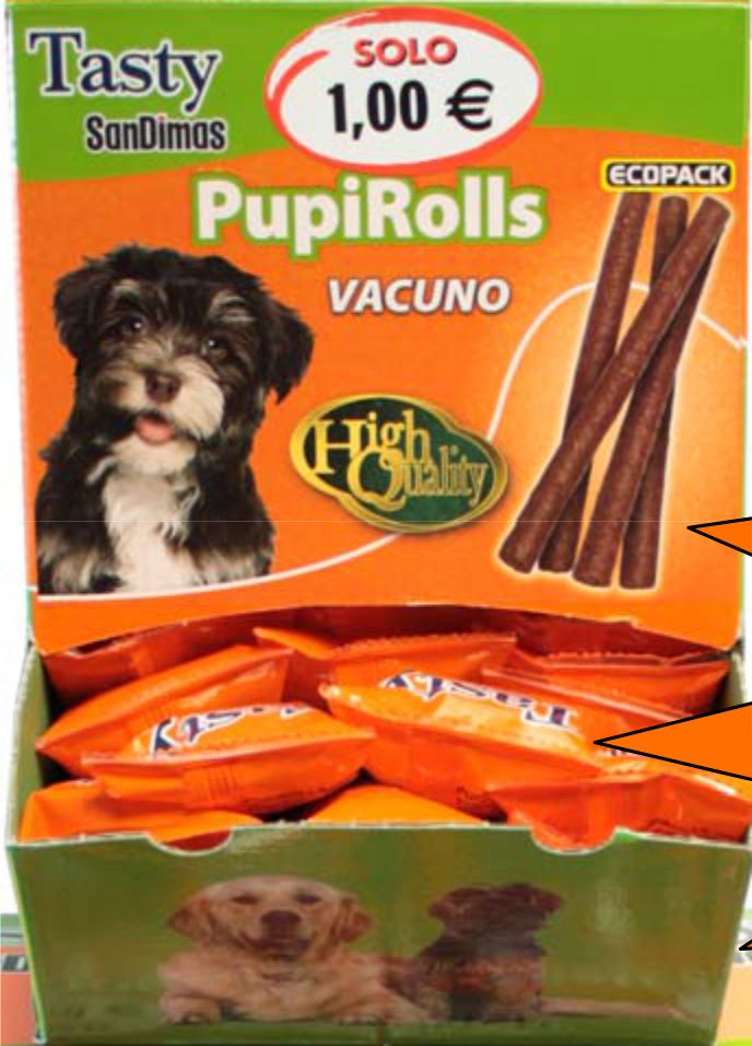 Delicioso snacks.COMPOSICION: Cereales, Carnes y Derivados de origen animal (min 4 % vacuno), Derivados de origen vegetal, Azúcares, Aceites y grasas, Aditivo (CE) :Conservantes y Colorantes.COMPOSICION ANALITICA: Proteina bruta 20 %Materia grasa 6%Fibra bruta 2.5%Ceniza bruta 8.5%MODO DE USO.Una pieza al día como premio o recompensa.