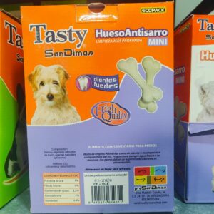 Tasty San Dimas – Hueso Antisarro MiniCon los Huesos Antisarro Mini, mantendremos los dientes de nuestras mascotas limpios y sanos. Garantiza una completa limpieza dental, ya que ayuda a eliminar el sarro acumulado, previene la formación de placa y fortalece los dientes.Los huesos son golosinas muy nutritivas y perfectas para dar como premio o recompensa a cualquier hora del dia. COMPOSICIÓN:Almidón de maíz, Glicerina.COMPONENTES ANALÍTICOS:Humedad 4,4%, Proteína bruta 1,0%, Contenido de grasa 2,5%, Fibra bruta 0%, Ceniza bruta 5%.PRESENTACION:Bote de 150gr.Cajas 40 bolsitas (2 und. cada una)