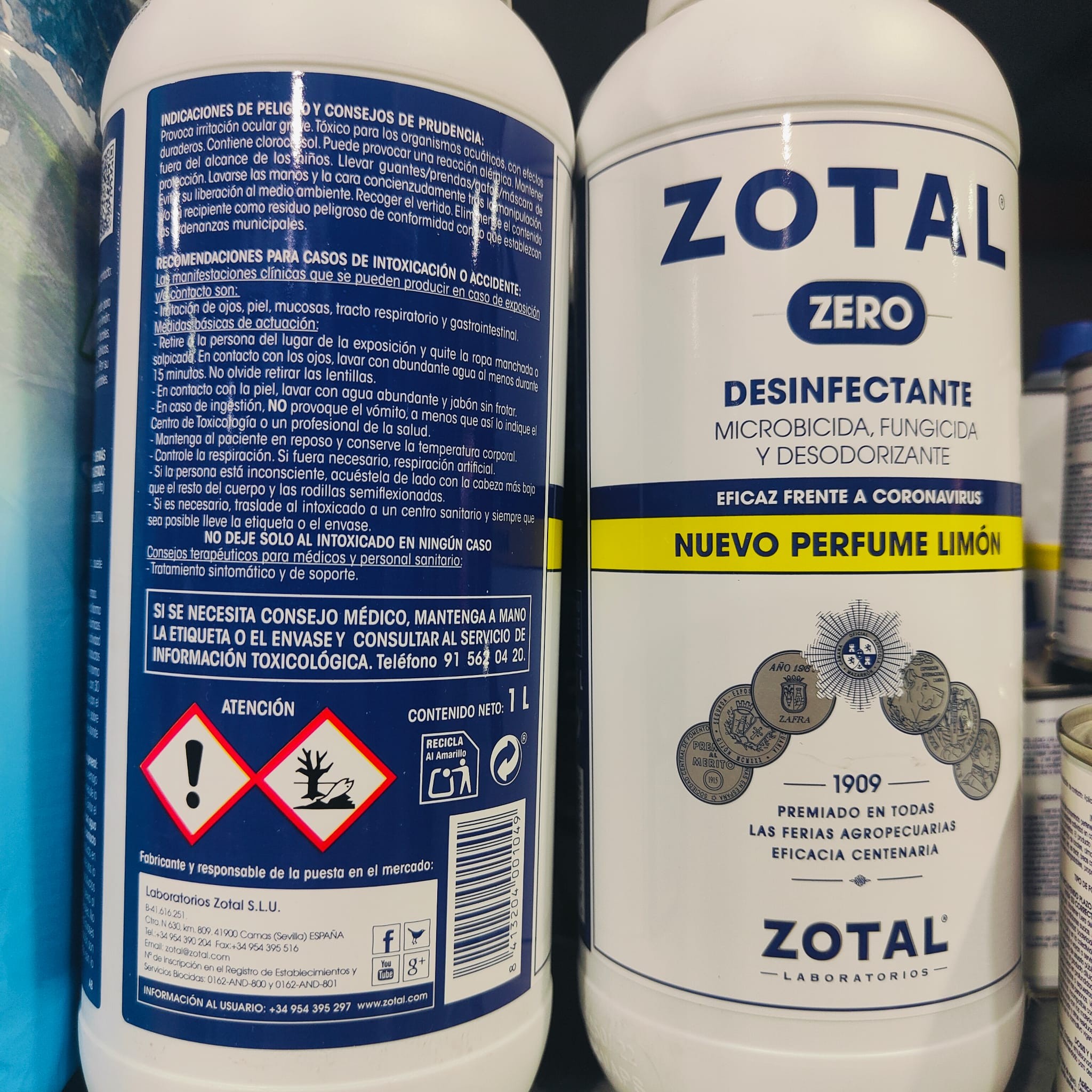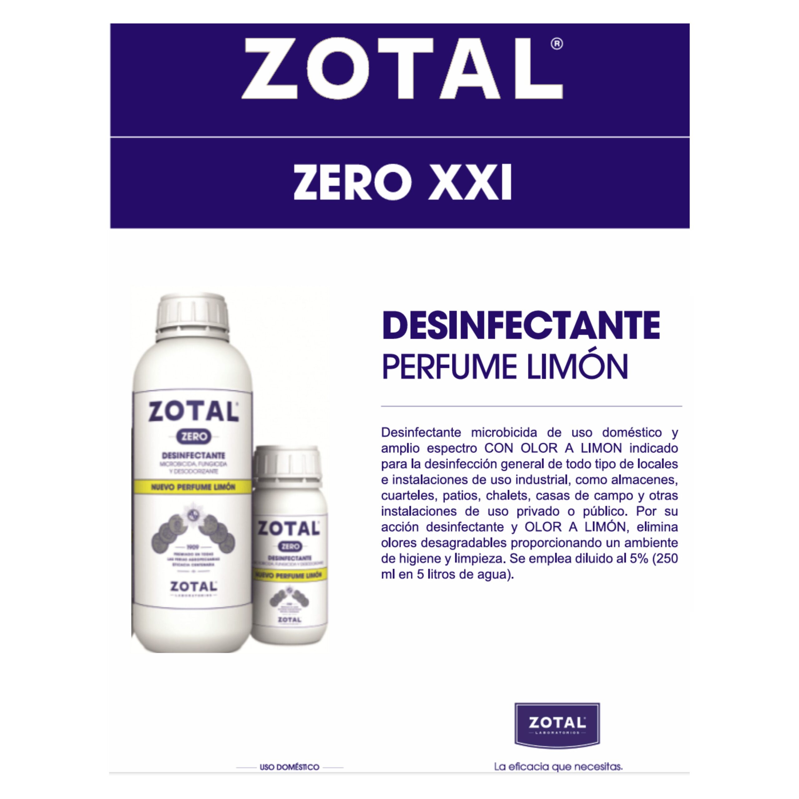 ZOTAL® Zero es un desinfectante microbicida con OLOR A LIMÓN. Es exactamente igual que el Zotal de siempre, por lo que está indicado para ser utilizado en almacenes, cuarteles, patios, chalets, casas de campo y otras instalaciones. Por su acción desinfectante microbicida con OLOR A LIMÓN, elimina olores desagradables proporcionando un ambiente agradable de higiene y limpieza, dejando la zona tratada con un olor agradable y a limpio.AplicacionesEl preparado ZOTAL® Zero, desinfectante microbicida en forma de líquido emulsionable, debe su acción a su contenido en fenoles sintéticos, confiriéndole propiedades microbicidas, fungicidas y desodorizantes. Para su utilización eficaz es necesario diluirlo en agua y aplicar por contacto. El resto de componentes favorecen la acción desinfectante y bactericida, ayudando a la limpieza y asegurando la humectación y penetración del producto. Con ello, se consigue una mayor eficacia del mismo.Modo de empleoZOTAL® Zero se emplea diluido al 5% en agua (250 ml en 5 litros de agua) para riegos y baldeos o por frotamiento, remojo o pulverización. De esta forma, este desinfectante microbicida está recomendado para desinfectar aquellos lugares que puedan albergar microbios. Así, los ingredientes activos de este desinfectante con olor a limón ejercen una acción sinérgica y persistente.ComposiciónÁcido glicólico 0,1 %, Bifenil-2-ol 4 %, Clorocresol 0,9 %, Excipiente: c.s.p. 100% GHS07: Toxico, Irritante, Narcotivo, Peligroso . GHS09: Dañino para el Medio Ambiente . Puede provocar irritacion de ojos, piel, mucosas, tracto respiratorio y gastrointestinal.