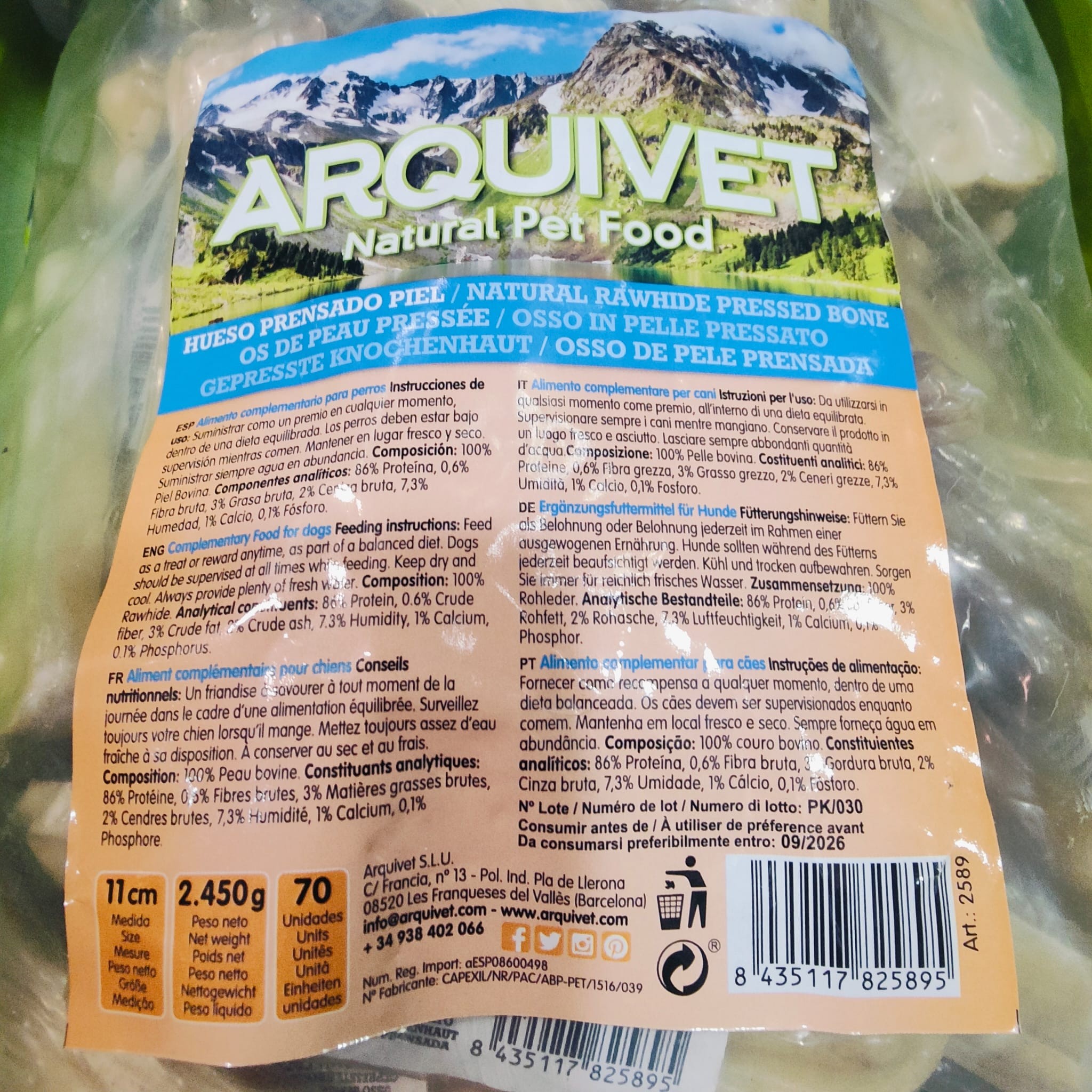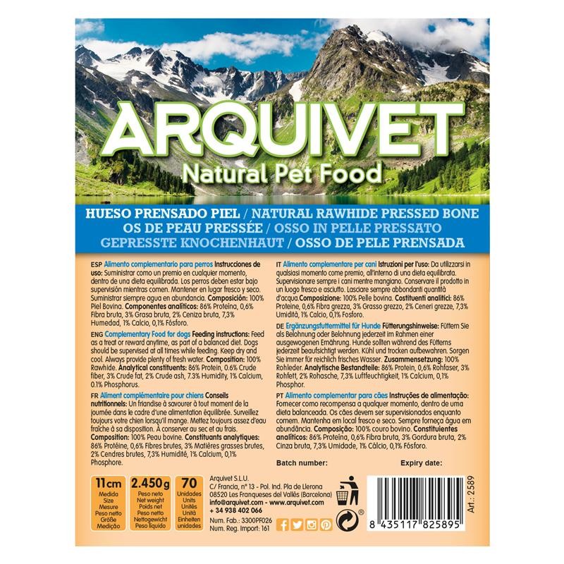 Hueso prensado piel.INGREDIENTES: 100% piel bovina.CONSTITUYENTEA ANALÍTICOS:Proteína 86%Fibra Bruta 0.6%Grasa Bruta 3%Cenizas 2%Humedad 7.3%Calcio 1%Fósforo 0.1%Peso del Hueso 35 gr.