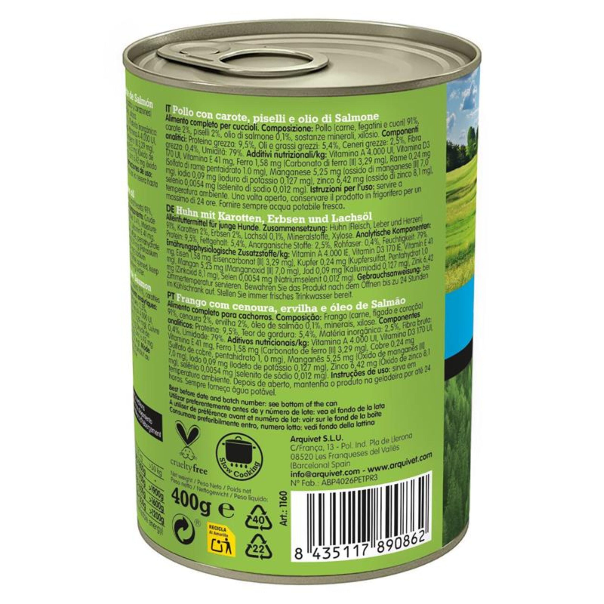 Alimento húmedo completo para perros jóvenes. A base de pollo con zanahorias, guisantes y aceite de salmón. Ingredientes 100% naturales. Sin cereales. Recetas nutricionalmente equilibradas formuladas por veterinarios y nutrólogos. Cocinadas a fuego lento para preservar todos los elementos nutritivos.Alimento completo para cachorros o perros jovenes.Composición: Pollo (carne, hígados y corazones) 91%, zanahorias 2%, guisantes 2%, aceite de salmón 0,1%, minerales, xilosa.Componentes analíticos: Proteína: 9,5%, Contenido de grasa: 5,4 %, Materia inorgánica: 2,5%, Fibra bruta: 0,4%, Humedad: 79%.Aditivos nutricionales/kg: Vitamina A 4.000 UI, Vitamina D3 170 UI, Vitamina E 41 mg, Hierro 1,58 mg (Carbonato de hierro [II] 3,29 mg), Cobre 0,24 mg (Sulfato de cobre, pentahidrato 1,0 mg), Manganeso 5,25 mg (Óxido de manganeso [II] 7,0 mg), yodo 0,09 mg (yoduro de potasio 0,127 mg), zinc 6,42 mg (óxido de zinc 8,1 mg), selenio 0,0054 mg (selenito de sodio 0,012 mg).Instrucciones de uso: Dejar siempre a libre disposición del perro, agua fresca y limpia. Conservar en un lugar fresco y seco. Servir a temperatura ambiente. Una vez abierto mantener en el frigorífico un máximo de 24 h. Sin colorantes, conservantes ni sabores artificiales.