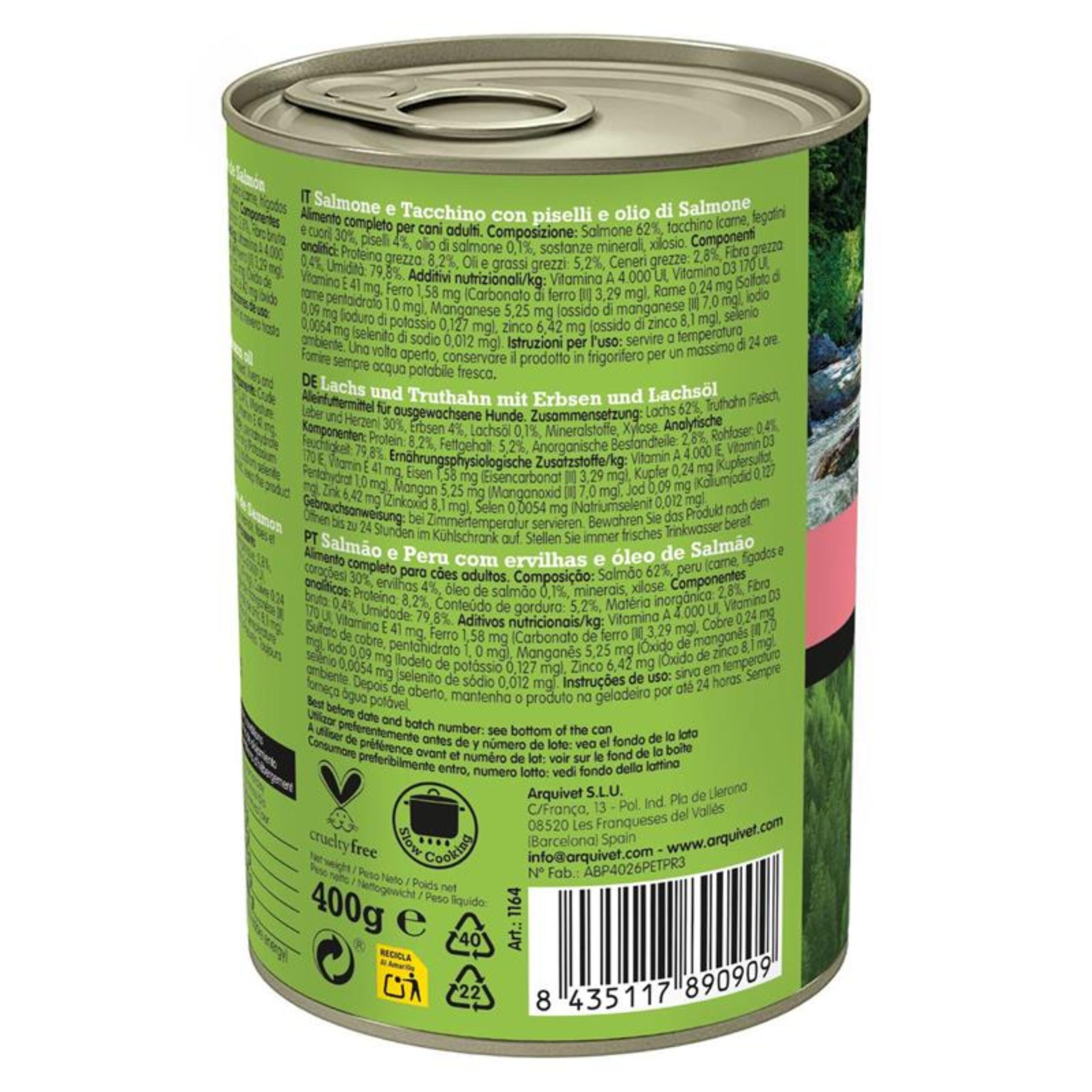 Alimento húmedo completo para perros de todas las razas. A base de salmón y pavo con guisantes y aceite de salmón. Ingredientes 100% naturales. Sin cereales. Recetas nutricionalmente equilibradas formuladas por veterinarios y nutrólogos. Cocinadas a fuego lento para preservar todos los elementos nutritivos.Alimento completo para perros.COMPOSICIÓN: 51% Pavo, 28,9% Caldo, 15% Salmón, 4% Guisantes, 1% Minerales, 0,1% Aceite de salmón. Componentes analíticos: Proteína: 10,5%, Contenido de grasa: 5,6%, Materia inorgánica: 2,8%, Fibra bruta: 0,4%, Humedad: 78%.ADITIVOS/KG: ADITIVOS NUTRICIONALES: zinc (monohidrato de sulfato de zinc): 25 mg, manganeso (monohidrato de sulfato manganoso): 1,4 mg, cobre (cobre (II) sulfato pentahidratado): 1 mg, yodo (yodato de calcio anhidro): 0,75 mg.INSTRUCCIONES DE USO: Dejar siempre a libre disposición del perro, agua fresca y limpia. Conservar en un lugar fresco y seco. Servir a temperatura ambiente. Una vez abierto mantener en el frigorífico un máximo de 24 h.Sin colorantes, conservantes ni sabores artificiales.