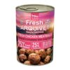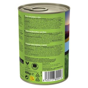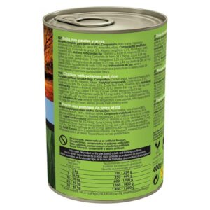 Alimento húmedo completo para perros mayores de todas las razas. A base de pollo con patatas y arroz. Bajo en calorías. Ingredientes 100% naturales. Sin cereales. Recetas nutricionalmente equilibradas formuladas por veterinarios y nutrólogos. Cocinadas a fuego lento para preservar todos los elementos nutritivosAlimento completo para perros mayores.Composición: Pollo (carne, hígados y corazones) 88%, patatas 4%, arroz 4%, minerales, xilosa.Componentes analíticos: Proteína: 8,3%, Contenido de grasa: 5 %, Materia inorgánica: 2,5%, Fibra bruta: 0,6%, Humedad: 80%.Aditivos nutricionales/kg: Vitamina A 4.000 UI, Vitamina D3 170 UI, Vitamina E 41 mg, Hierro 1,58 mg (Carbonato de hierro [II] 3,29 mg), Cobre 0,24 mg (Sulfato de cobre, pentahidrato 1,0 mg), Manganeso 5,25 mg (Óxido de manganeso [II] 7,0 mg), yodo 0,09 mg (yoduro de potasio 0,127 mg), zinc 6,42 mg (óxido de zinc 8,1 mg), selenio 0,0054 mg (selenito de sodio 0,012 mg).Sin colorantes, conservantes ni sabores artificiales. Instrucciones de uso: Dejar siempre a libre disposición del perro, agua fresca y limpia. Conservar en un lugar fresco y seco. Servir a temperatura ambiente. Una vez abierto mantener en el frigorífico un máximo de 24 h.