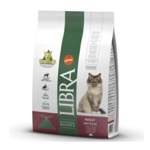 Pienso para gatos adultos Libra de BueyLibra Adult con Buey es un pienso para gatos elaborado con ingredientes de alta calidad. Su fórmula proporciona una alimentación completa y equilibrada para cubrir todas las necesidades nutricionales de los gatos adultos. Con este pienso los felinos están sanos por dentro y por fuera, contribuyendo a que tengan una condición física óptima para que puedan realizar todas sus actividades diarias.El pienso Libra Adult Buey se elabora con cereales como el arroz y carnes como la carne de buey deshidratada. Esta combinación ofrece un aporte adecuado de hidratos de carbono y proteínas de calidad. Además, el pienso también aporta vitaminas A, D3 y E y minerales para reforzar las defensas naturales y proteger el sistema inmunitario, así como mantener el tracto urinario sano. La receta también contribuye a que los gatos tengan una piel sana y un manto brillante, además de controlar las bolas de pelo para evitar problemas digestivos.También puedes elegir el resto de piensos para gatos de Libra: con pollo o salmón, para gatitos o para gatos esterilizados.VENTAJAS DE LIBRA ADULT BUEY:Pienso completo y equilibrado para gatos.Con carne de buey deshidratada.Contribuye a mantener una buena condición física.Tracto urinario sano.Pelaje brillante y piel sana.Control de las bolas de pelo.Con vitaminas y minerales.USO Y ESPECIFICACIONES:Pienso con buey para gatos adultos adecuado para una alimentación completa y equilibrada.Descripción nutricional:Ingredientes: Cereales (4% arroz) carnes y subproductos animales (8% buey deshidratado) extractos de proteínas vegetales aceites y grasas sustancias minerales subproductos de origen vegetal.Constituyentes analíticos: Proteína 34% Contenido de grasa 13% Fibras brutas 2% Materia inorgánica 7,5%.Aditivos nutricionales: Vitamina A 27.000 IU Vitamina D3 1.800 IU Vitamina E 163 mg Taurina 800 mg Sulfato ferroso monohidratado (Fe: 117 mg) 355 mg Yoduro de potasio 2,55 mg Sulfato de cobre pentahidratado 45 mg Sulfato manganoso monohidratado 168 mg Sulfato de zinc monohidratado (Zn: 80 mg) 220 mg Selenito de sodio (Se: 0,15 mg) 0,33 mg.Dosificación: PesoCantidad diaria recomendada2 – 4 kg40 – 65 g4 – 6 kg65 – 90 g6 – 8 kg90 – 105 g