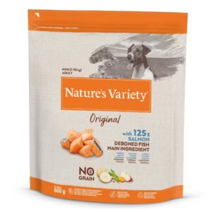 Nature’s Variety Original No Grain Mini pienso de salmón para perros de razas pequeñasTu True Instinct de siempre es ahora Nature’s Variety, con las mismas características nutricionales y sabor, pero con una nueva fórmula mejorada.El pienso para perros Nature’s Variety Original Mini con salmón es un alimento completo y nutritivo recomendado para perros adultos de razas pequeñas, de entre 1 y 10 kilogramos de peso. Su fórmula exclusiva tiene como ingrediente principal el salmón, un pescado rico en proteínas que aportará a tu mascota la energía y calorías necesarias para el desarrollo óptimo de su actividad diaria. Es un alimento libre de gluten y cereales, perfecto si tu perro tiene intolerancia a alguno de esos elementos.Una buena dieta es esencial en el desarrollo de un perro, por eso es importante elegir el alimento adecuado para tu mascota, uno que contenga todos los ingredientes y sustancias que sean necesarias para tu mejor amigo. El pienso Nature’s Variety Original Mini Salmón está elaborado con ingredientes naturales de gran calidad. Su fórmula está cuidadosamente estudiada para que el animal obtenga todos los beneficios necesarios para un desarrollo óptimo combinando su ingrediente principal, el salmón sin espinas, con una variedad de frutas y verduras.Las vitaminas y minerales contenidos en este alimento favorecerán el aumento de sus defensas y lo mantendrá sano y fuerte, y como fuente de carbohidratos este producto contiene garbanzos, guisantes y patatas. Para el cuidado de la piel y el pelo de tu mascota, el pienso Nature’s Variety lleva una serie de ácidos grasos: omega 3 y omega 6 y zinc. Las fibras y proteínas ayudarán en la actividad digestiva del animal. Sin duda, un alimento completo que cuida tanto el cuerpo como la mente de tu mejor amigo.Gracias a las proteínas y al contenido de vitamina E, vitamina C y selenio, con propiedades antioxidantes, el sistema inmunitario también se verá reforzado. Por todo esto el pienso Nature’s Variety Original No Grain Mini es un alimento excelente para tu mascota, que disfrutará del delicioso sabor a pescado de su comida mientras cuida y desarrolla su organismo y condición física.La gama de alimentos Nature’s Variety cuenta con productos específicos para cada tipo de perro: perros adultos, cachorros, perros de razas grandes, medianas o pequeñas y productos sin gluten para que elijas el que más se adecue a tus necesidades y las de tu mascota. VENTAJAS DEL PIENSO NATURE’S VARIETY ORIGINAL MINI SALMÓN:Comida seca para perros adultos elaborada con ingredientes naturales.Con un 50% de ingredientes animales seleccionados.Con frutas, verduras, vitaminas y minerales.No contiene cereales ni gluten, perfecto para perros con intolerancias.Hecha con salmón de primera calidad, lo que aporta un delicioso sabor y ácidos grasos esenciales.Proteínas de alto valor biológico.Pienso indicado para perros adultos de razas pequeñas (entre 1 y 10 kg).Favorece el bienestar digestivo del perro y ayuda a reforzar su sistema inmunitario.USO Y ESPECIFICACIONES:Pienso de salmón sin gluten ni cereales para perros adultos, especialmente indicado para razas pequeñas, de 1 a 10 kg, con ingredientes naturales y de calidad que cuidan la salud.Descripción nutricional:Ingredientes: Carne de salmón sin espinas* (21%), proteína deshidratada de atún (14%) guisantes deshidratados* (14%), almidón de guisante*, grasa avícola* (8%), garbanzos deshidratados* (7%), patata deshidratada* (5%), proteína de patata, hidrolizado de proteína (4%), proteína deshidratada de salmón (3%), fibra de guisante*, raíz de achicoria deshidratada*, zanahoria deshidratada* (0,5%, equivalente a un 4% de zanahoria fresca), manzana deshidratada* (0,3%, equivalente a un 2% de manzana fresca), sustancias minerales. *Ingredientes naturales.Constituyentes analíticos: Proteína bruta 29%, grasa bruta 18%, fibra bruta 4%, ceniza bruta 8%, O3 1%, O6 2,8%.Aditivos nutricionales: Vitamina A 27000 UI, vitamina E 410 mg, vitamina C 350 mg, sulfato de hierro(II) monohidratado 260 mg (Fe: 86 mg), yoduro de potasio 1,9 mg (I: 1,4 mg), sulfato de cobre(II) pentahidratado 33 mg (Cu: 8,8 mg), sulfato de manganeso monohidratado 123 mg (Mn: 40 mg), sulfato de zinc monohidratado 363 mg (Zn: 128 mg), selenito de sodio 0,24 mg (Se: 0,11 mg).