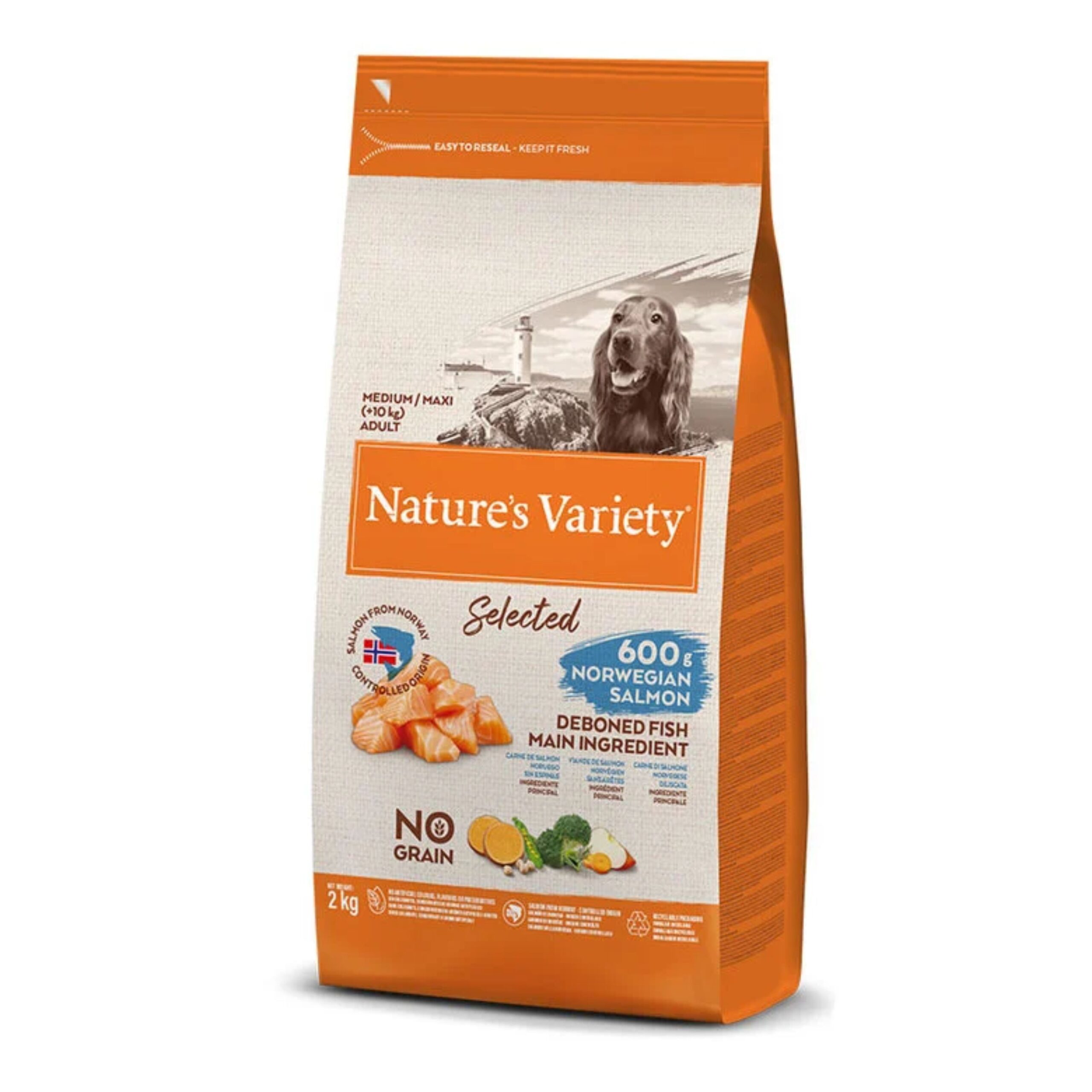 Nature’s Variety Selected No Grain Medium/Maxi pienso para perros de razas medianas y grandesTu True Instinct de siempre es ahora Nature’s Variety, con las mismas características nutricionales y sabor, pero con una nueva fórmula mejorada.El pienso para perros Nature’s Variety Selected Medium/Maxi Salmón es un alimento completo, equilibrado y de primera calidad que cuida la salud de tu mejor amigo. Está elaborado con un 56% de ingredientes animales seleccionados acompañados de frutas y verduras. La receta está libre de cereales y gluten para favorecer una digestión saludable y para perros con intolerancias o alergias a los granos.Nature’s Variety es un alimento con un alto nivel de energía y proteínas, ideal para cubrir las necesidades nutricionales de los perros con una vida activa. La fórmula es alta en proteínas y baja en carbohidratos, con el boniato, los guisantes y los garbanzos como sustitutos de los cereales para que los hidratos sean más digeribles. Su primer ingrediente es el salmón noruego sin espinas, seguido del atún y de multitud de ingredientes saludables como la manzana, la zanahoria, el brócoli y las algas. Una combinación excelente y adaptada a la nutricional natural de los perros.La fórmula de Nature’s Variety ofrece a tu perro todo lo que necesita cada día, en su justa medida, para garantizar un estado de salud óptimo durante toda su vida. La receta mejora el metabolismo y la condición física, manteniendo la masa muscular. Además, le provee vitaminas y minerales, así como un alto nivel de antioxidantes para proteger y reforzar el sistema inmunitario.VENTAJAS DEL PIENSO NATURE’S VARIETY SELECTED MEDIUM/MAXI SALMÓN:Pienso completo y equilibrado para perros.Nutrición óptima.Sin cereales ni gluten.56% de pescado.Con frutas y verduras.Rico en vitaminas, minerales y antioxidantes.Sistema inmunitario sano.Digestión saludable.Sin conservantes, colorantes ni aditivos artificiales.USO Y ESPECIFICACIONES:Pienso para perros adultos de raza mediana y grande adecuado para un alimentación óptima y de primera calidad.Indicado para perros con intolerancias o alergia al gluten y a los cereales.Descripción nutricional:Ingredientes: Carne de salmón noruego sin espinas* (30%), guisantes deshidratados* (14%), proteína deshidratada de atún (13%), proteína deshidratada de salmón (7%), boniato deshidratado* (7%), almidón de guisante*, grasa avícola* (6%), garbanzos deshidratados* (5,5%), hidrolizado de proteína (3,5%), proteína de patata, raíz de achicoria deshidratada*, zanahoria deshidratada* (0,5%, equivalente a un 4% de zanahoria fresca), brócoli deshidratado* (0,5%, equivalente a un 4% de brócoli fresco), manzana deshidratada* (0,3%, equivalente a un 2% de manzana fresca), sustancias minerales, alga marina deshidratada* (0,01%), romero deshidratado* (0,01%). *Ingredientes naturales.Constituyentes analíticos: Proteína bruta 31%, grasa bruta 19,5%, fibra bruta 2,5%, ceniza bruta 8%, O3 1,2%, O6 3%.Aditivos nutricionales: Vitamina A 27000 UI, vitamina E 410 mg, vitamina C 350 mg, sulfato de hierro(II) monohidratado 260 mg (Fe: 86 mg), yoduro de potasio 1,9 mg (I: 1,4 mg), sulfato de cobre(II) pentahidratado 33 mg (Cu: 8,8 mg), sulfato de manganeso monohidratado 123 mg (Mn: 40 mg), sulfato de zinc monohidratado 363 mg (Zn: 128 mg), selenito de sodio 0,24 mg (Se: 0,11 mg).