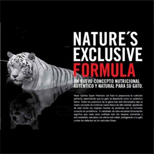VISAN OPTIMA NOVA CAT EXQUISITE (pollo y arroz), es un alimento completo para gatos adultos muy exigentes a partir de los 12 meses de edad.OMEGA 3 Y OMEGA 6:Protege al sistema inmunológico de numerosas enfermedades, ayuda a desarrollar la salud cardiovascular y el sistema nervioso durante la gestación y crecimiento. Evita que el pelo tenga un aspecto seco y quebradizo.SKIN AND COAT PROTECTION:La presencia de el Zinc ayuda a la regeneración de la piel, manteniéndola en un estado sano y vigoroso. Los ácidos grasos la fortalecen y consiguen un pelo fuerte y brillante.FOS+MOS INTESTINAL HEALTH:El efecto prebiótico del FOS, estimula la flora bacteriana beneficiosa del sistema digestivo (efecto bífidus). Los MOS eliminan la flora perjudicial, logrando una mejor salud digestiva.HIGT PALATABILITY:La elevada calidad y frescura de los ingredientes, junto a una excelente combinación de aceites, carnes y extractos consiguen una máxima apetencia estimulando el consumo de nuestro alimento.COMPOSICIÓN:Pollo fresco (40%), carne de pollo deshidratada(30%), arroz (12%), maiz, aceite de pollo, hidrolizado de higado de pollo (5%), gluten de maiz, proteina de arroz, pulpa de remolacha, celulosa, levadura, aceite de pescado, cloruro sódico, proteina de patata, polifosfatos de sodio, Inulina (0.1%, fuente de fructo-oligosacáricos, Manano-oligosacáridos (0.1%), cloruro de potasio.CONSTITUYENTES ANALÍTICOS:Proteína bruta 33%, aceites y grasas brutas 15%, ácidos grasos omega 6: 2,5% ácidos grasos omega 3: 0,5%, fibra bruta 3%, fibra dietética total 7,0%, ceniza bruta 7,0%, Calcio 1,1%, Fósforo 0,9%, humedad 9,%.ADITIVOS:Aditivos Nutricionales:Vitamina A 20.000 UI7mg, Vitamina D3 1.500 UI / mg, Vitamina E 600 mg/kg, Vitamina C 75 mg, L-Tautina 2.100 mg/kg, DL-metionina 1.000 mg/kg, Hierro (sulfato ferroso monohidratado) 150 mg/kg, Yodo (yoduro potásico) 3,0 mg/kg, Cobalto (sulfato heptahidratado): 1,2 mg/kg, Cobre (sulfato cúprico pentahidratado) 8 mg/kg, Manganeso (sulfato manganoso monohidratado) 8 mg/kg, Zinc (óxido de zinc) 120 mg/kg, Selenio (selenito sódico) 0,18 mg/kg, extacto de yucca 170 mg/kg, extractos de cítricos ricos en bioflavonoides 900 mg/kg.Aditivos Tecnológicos:Protegido con antioxidantes naturales (tocoferoles) con efecto antienvejecimiento eliminando los radicales libres (propiciadores de la acción tumoral).Disponible en envases de 400 gr, 2 kg y 8 kg.