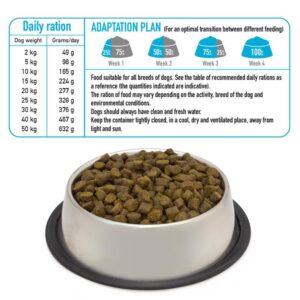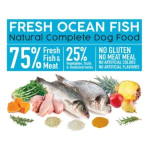 Alimento completo semihúmedo para todo tipo de perros adultos, con un 55% de pescado, un 20% de pollo y un 25% de vegetales, frutas y hierbas medicinales. Prensado en frío, no extruido, procesamiento mínimo. Sin gluten, sin harinas cárnicas, sin colorantes ni aromatizantes artificiales. Cocinado lentamente y a baja temperatura.COMPOSICIÓN: 55% pescado fresco, 20% pollo fresco, arroz, pulpa remolacha molida, calabaza, levadura cerveza, achicoria, piña, pera, manzana, curcuma, romero, tomillo.COMPONENTES ANALÍTICOS: Proteína 27%, fibra bruta 1,5%, grasa bruta 17%, materia inorgánica 6%, humedad 20%. Energía metabolizable/Kg: 3.750 Kcal / 14.176 Kj.ADITIVOS NUTRICIONALES (por kg MS): Vitaminas (IU): Vitamin A (3a672a) 22726, Vitamin D3 (3a671): 1450, Vitamin E (3a700):454. Minerales (mg): 3b503(Mn:36), 3b103(Fe:72), 3b405(Cu:7.2), 3b603(Zn:100), 3b201(I:1.27).MODO DE EMPLEO:Alimento apto para todas las razas de perros.Tome como referencia la tabla de cantidades diarias recomendadas (las cantidades indicadas son orientativas). La cantidad de alimento puede variar en función de la actividad, raza del perro y condiciones medioambientales.Los perros deben disponer siempre de agua limpia y fresca.Mantener el envase bien cerrado, en un lugar fresco, seco y ventilado, lejos de la luz y el sol.Este producto tiene una vida útil de 15 meses.